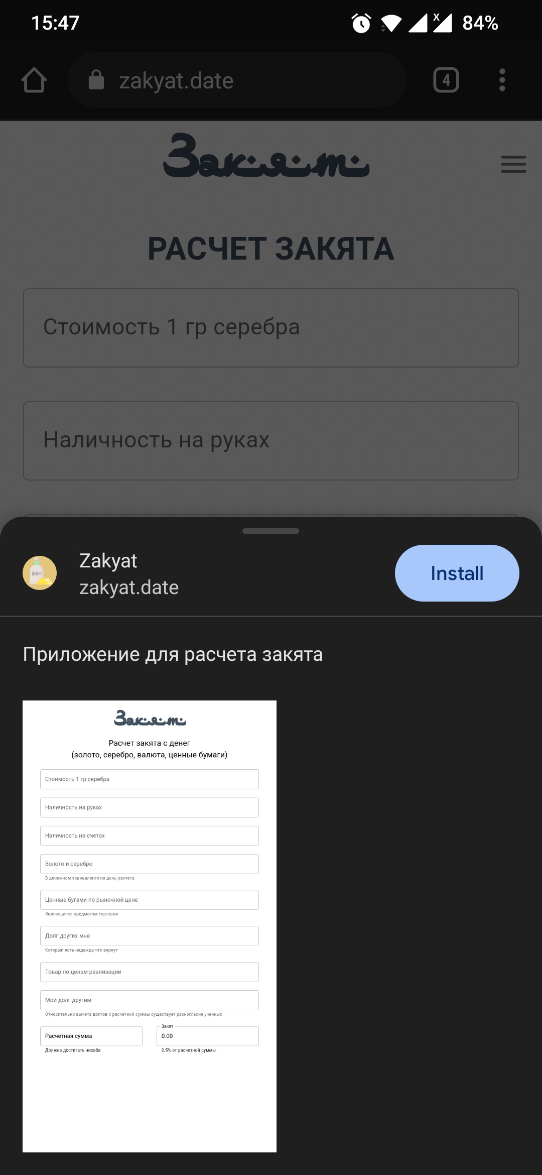 Если результат по расчету введенных данных достигает нисаба (минимального уровня, попадающего под закят), приложение автоматически расчитает сумму необходимую для оплаты закята (2.5% от имеющейся суммы) и запишет его в соответствующее поле "Закят" в конце приложения. Это и будет той суммой которую необходимо заплатить через год (по лунному календарю), если только она не стала меньше нисаба в течении этого года (в таком случае отсчет начинается с того момента, как появилась сумма, достигающая нисаба).