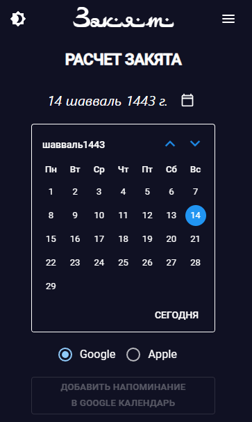 Для добавления уведомления в календарь необходимо раскрыть календарь на главном экране. Кнопка добавления будет активной только после того как в результате вычислений сумма закята станет положительной. Далее необходимо выбрать дату в календаре от которой будет вестись отчет до наступления выплаты закята и примерно за 10 дней до окончания этого срока (год по лунному календарю) будет прислано уведомление через календарь. Если дату не выбрать будет установлен отчет от текущего дня на момент добавления уведомления. Для Google календаря открывается страница добавления уведомления, для Apple календаря скачивается файл календаря при открытии которого будет предложено добавить уведомление. При установке уведомления есть возможность выбора уведомления на почту и времени уведомления (по умолчанию 12:00 мо МСК). В описании уведомления содержится информация о дате отсчета по хиджре и ссылка на данный сайт и приложение. По умолчанию уведомление приходит на телефон, где используется аккаунт Google/Apple календарь в который добавлено уведомление.