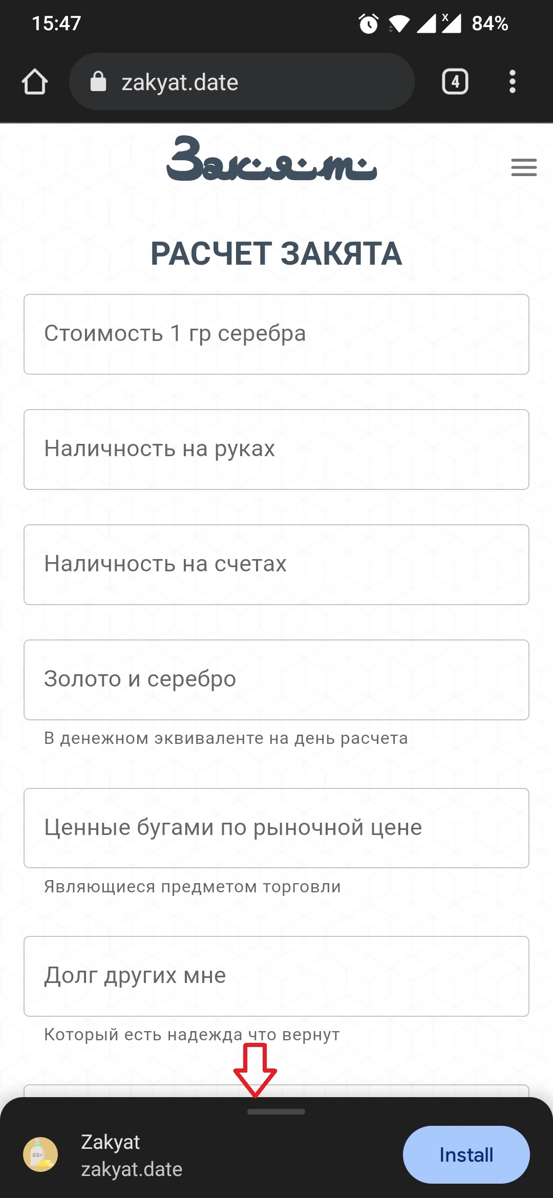 В поле "Стоимость 1 гр серебра" вводятся значения стоимости серебра на момент расчета закята. Без указания стоимости серебра не возможно будет расчитать закят. Также в приложении реализована возможность получения получения актуального курса стоимости серебра в рублях. Для этого нужна нажать соответствующую кнопку "Актуальный курс" находящуюся в поле "Стоимость 1 гр серебра". Информация о стоимости получается из внешних ресурсов интернета и соответствует стоимости серебра установленной в ЦБ РФ. Для получения этой информации вам необходим доступ в интернет, не смотря на то, что приложение может работать и в оффлайн режиме, иначе кнопка будет просто отключена.