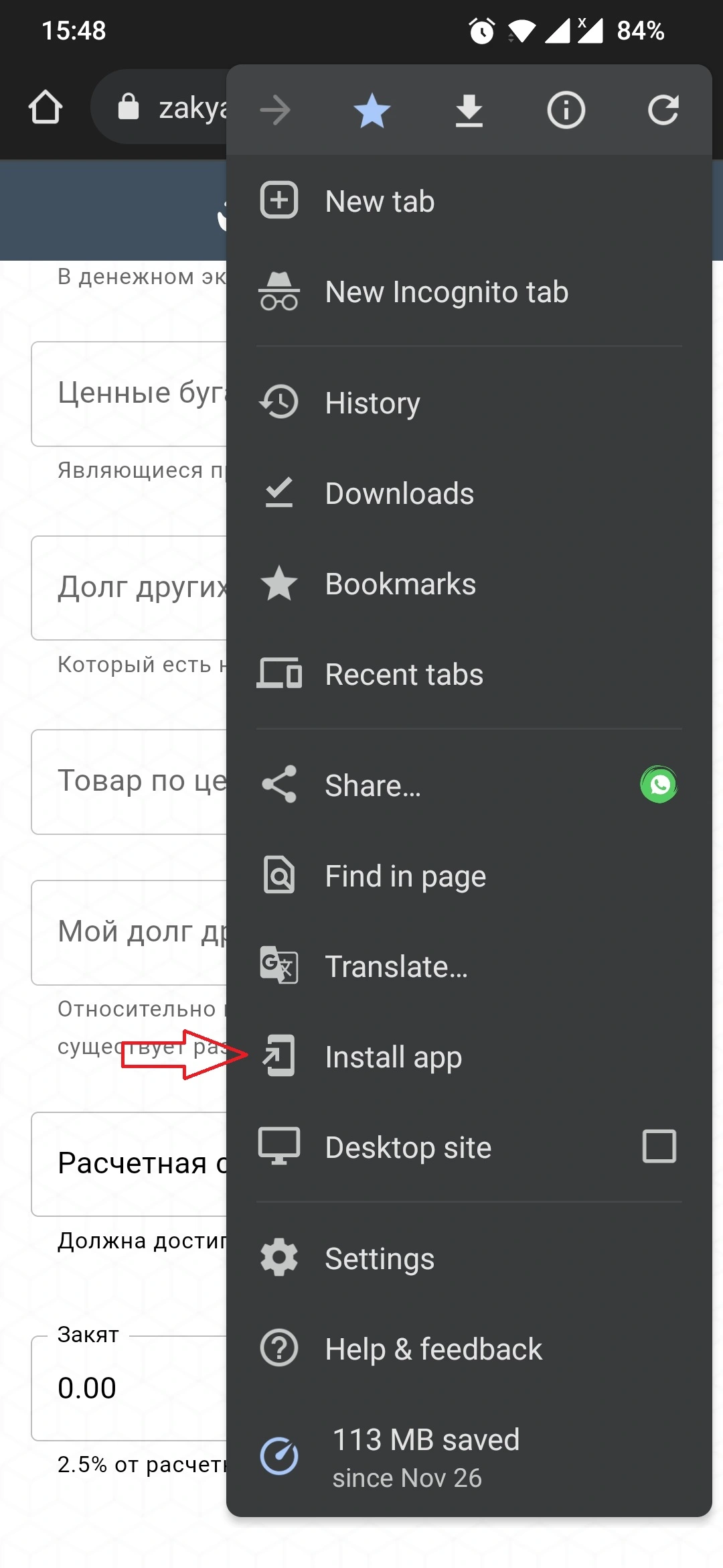 Если вдруг вы пропустили предлагаемую автоматически установку, всегда можно воспользоваться меню браузера и выбрать Установить приложение (Install app). После чего будет предложена установка.